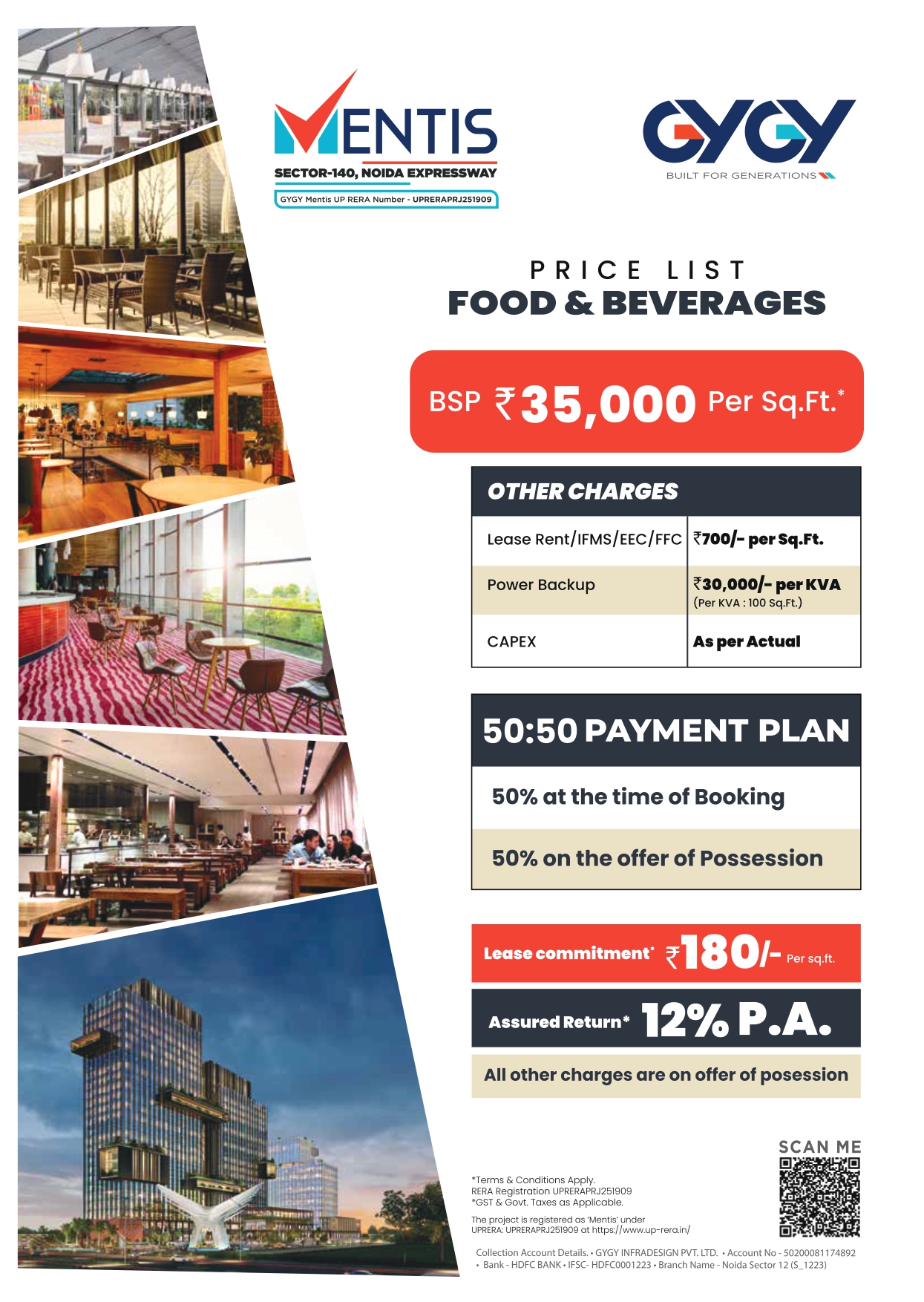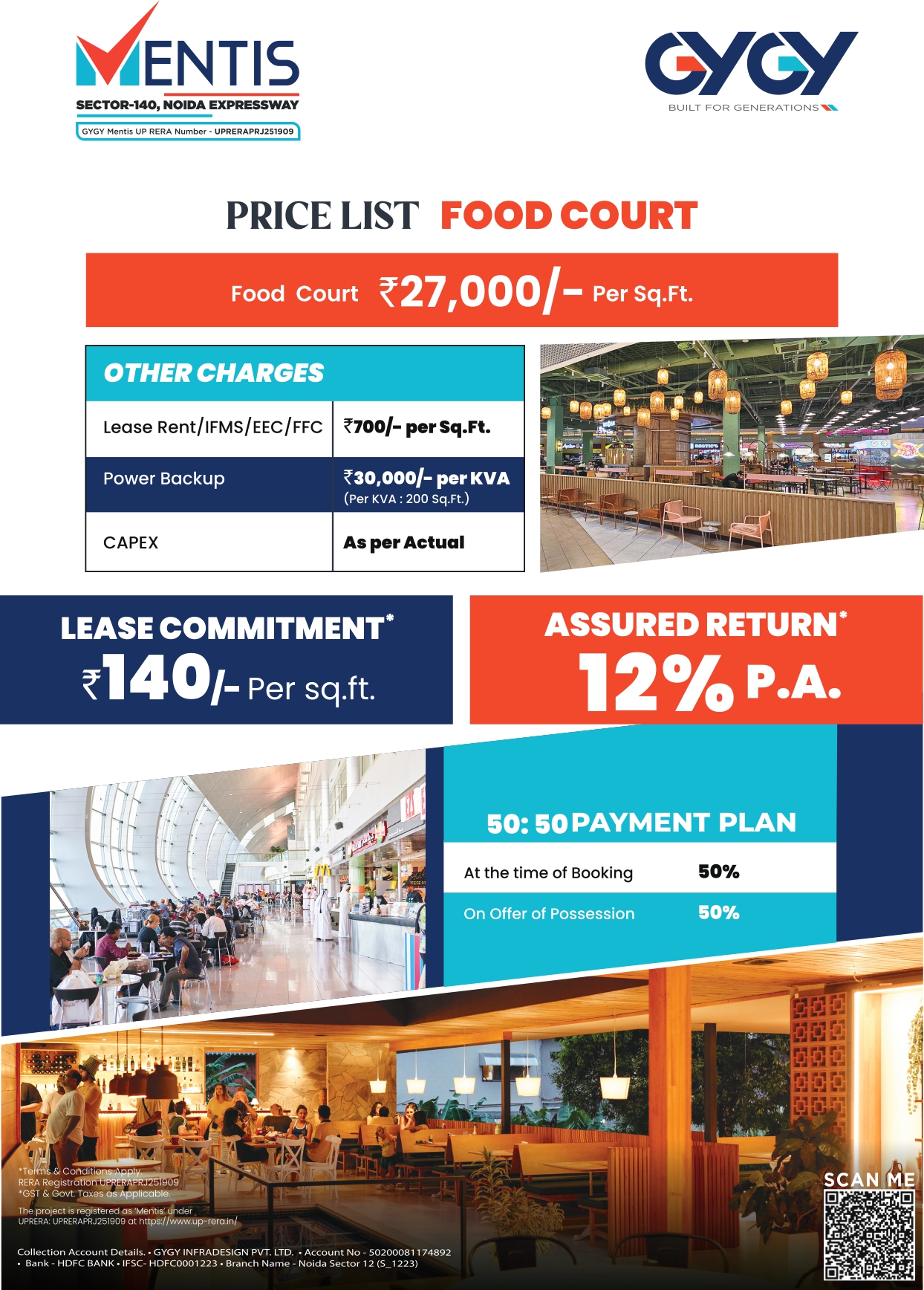Retail space located at GYGY Mentis, Sector-140 Noida Expressway – a strategic commercial hub offering modern retail units at ₹34,000 per sq.ft. These retail outlets promise high visibility, footfall, and assured returns of 12% per annum.